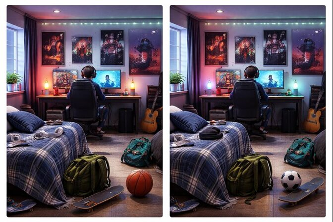 Crée deux images presque identiques représentant une scène de la vie quotidienne, avec sept différences visuelles discrètes, style réaliste. C’est pour un « jeu des 7 erreurs ».